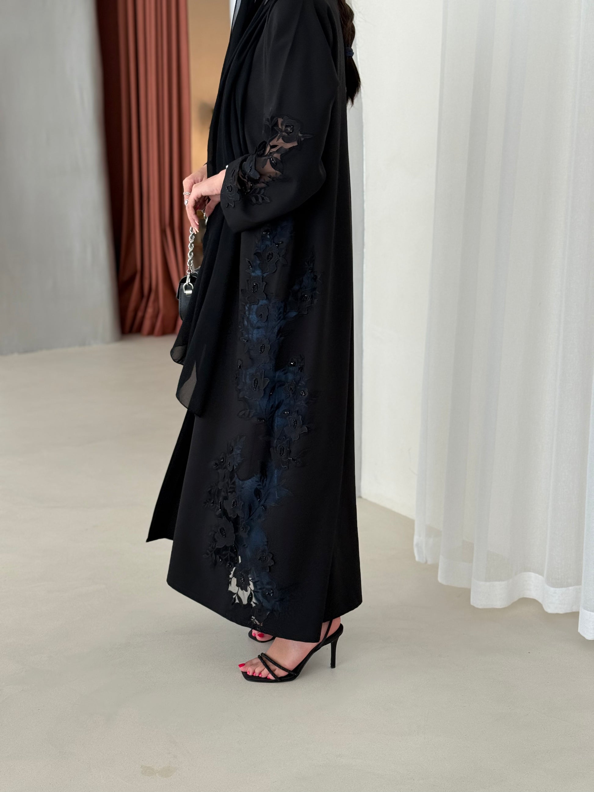 A full black abaya with a Klosh cut, adorned with intricate handwork for an elegant and graceful look.
