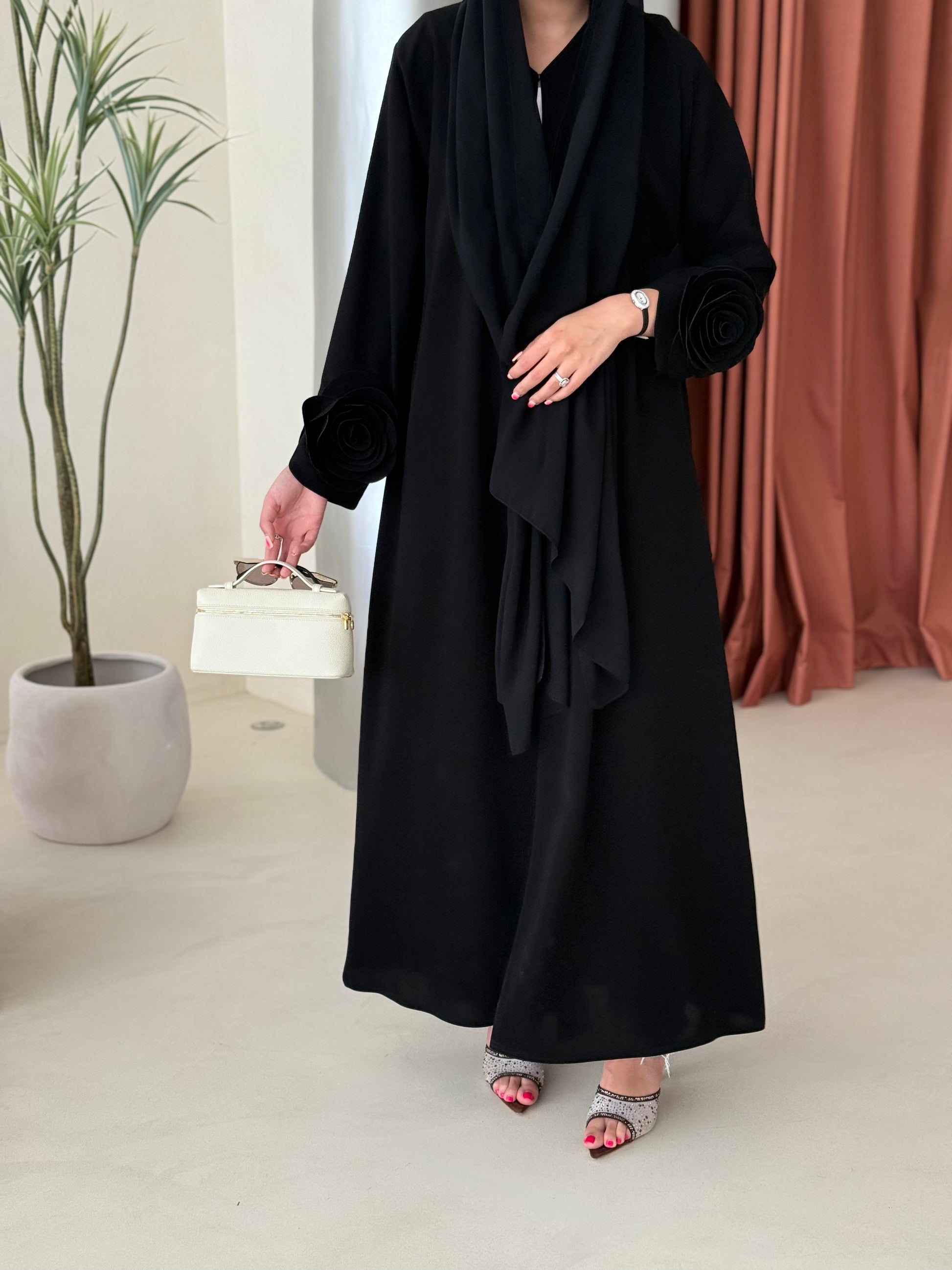A soft A-line abaya designed with a graceful flow, featuring a delicate flower detail on the sleeve that adds a subtle touch of femininity and elegance
