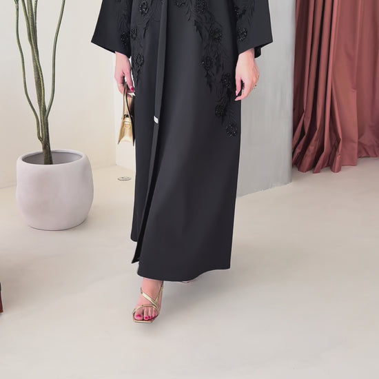 A black abaya featuring exquisite handwork and refined details, creating an elegant and sophisticated look